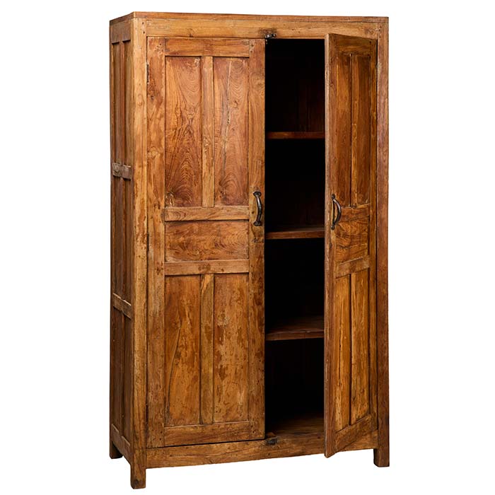 Questo armadio dallo stile retrò vintage è realizzato in pregiato legno riciclato, un materiale ecologico e ricco di storia che dona unicità a ogni pezzo. Il design semplice ma robusto, con doppia anta e mensole interne, lo rende ideale per riporre abiti, biancheria o oggetti personali con un tocco di fascino d’altri tempi.