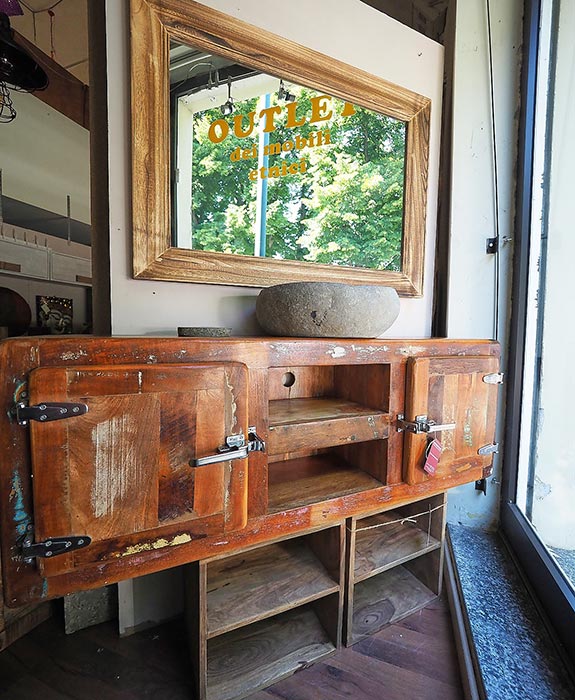 Composizione bagno con mobiletto retrò a 2 ante e base a cubi, mobile realizzato in legno massello Indiano. Specchio compreso, lavabo da € 219.
