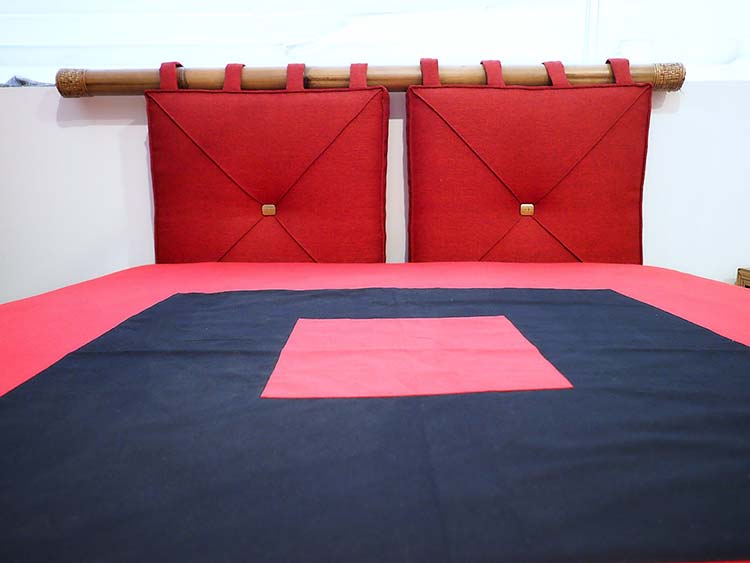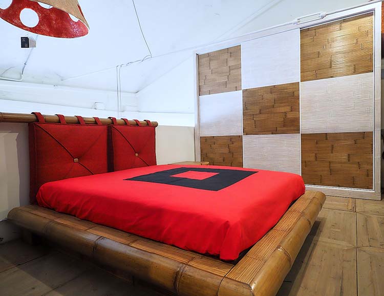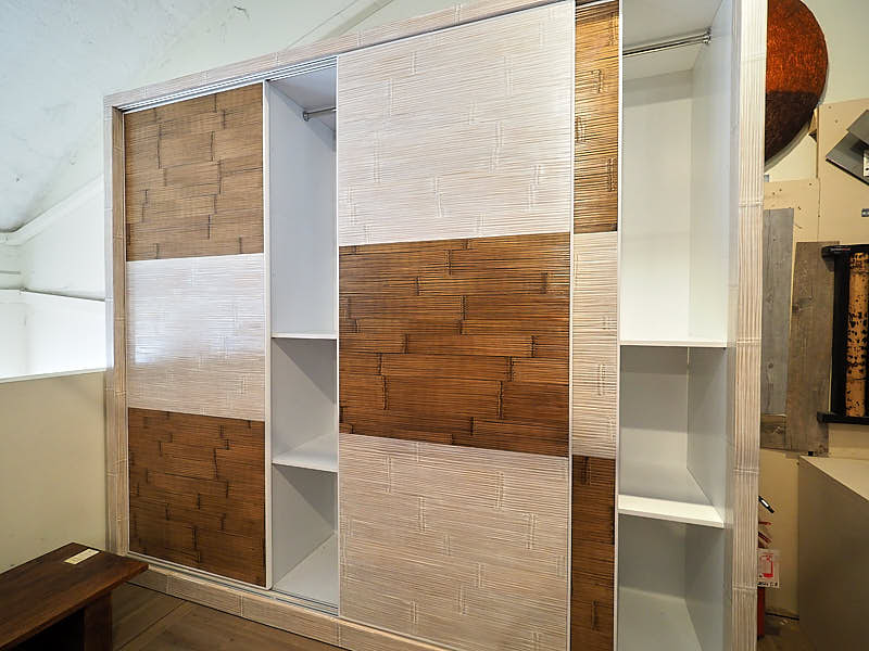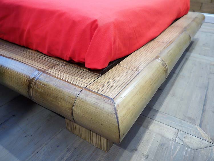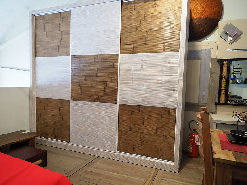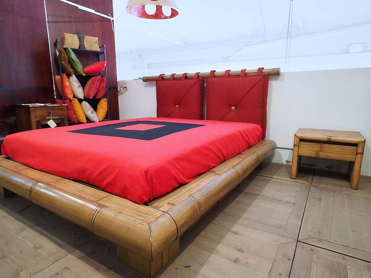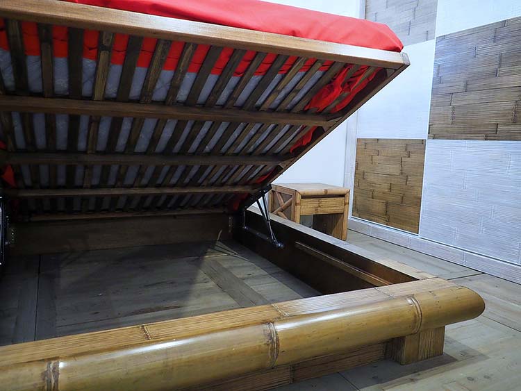Camera completa di letto matrimoniale contenitore, 2 comodini e armadio in bambù a 3 ante scorrevoli, molto capiente. Letto virunga contenitore in bambu da 197 cm di larghezza per 221 di lunghezza, alto 30 cm, testiera cuscini alta 90 cm. Armadio etnico moderno ad ante scorrevoli alto 250 cm e largo 283.