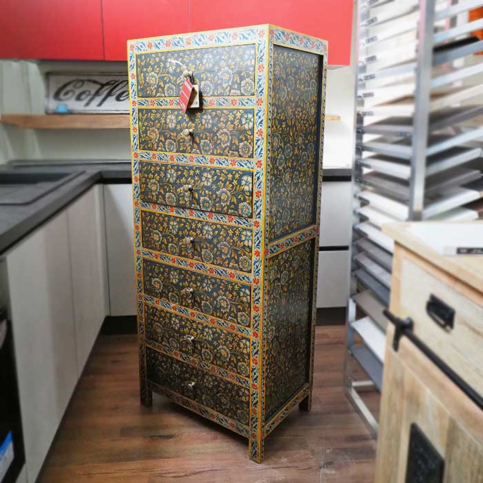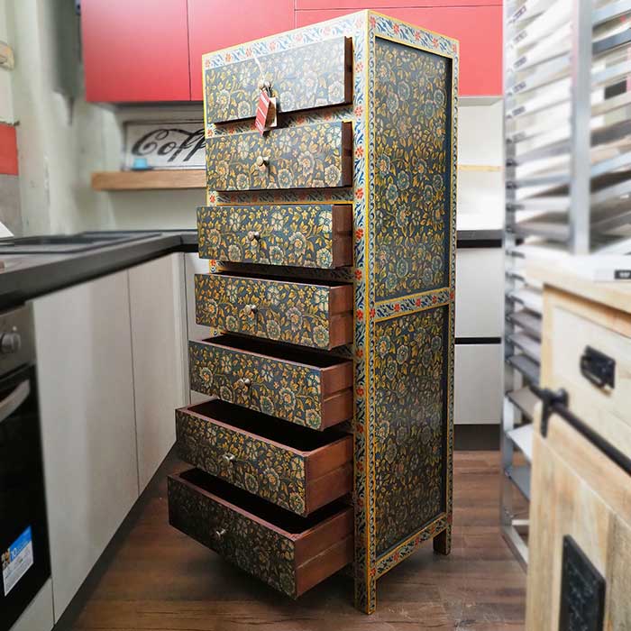 Mobiletto cassettiera molto particolare con dipinti floreali, mobile in legno massello con 7 cassetti. Provenienza India.
