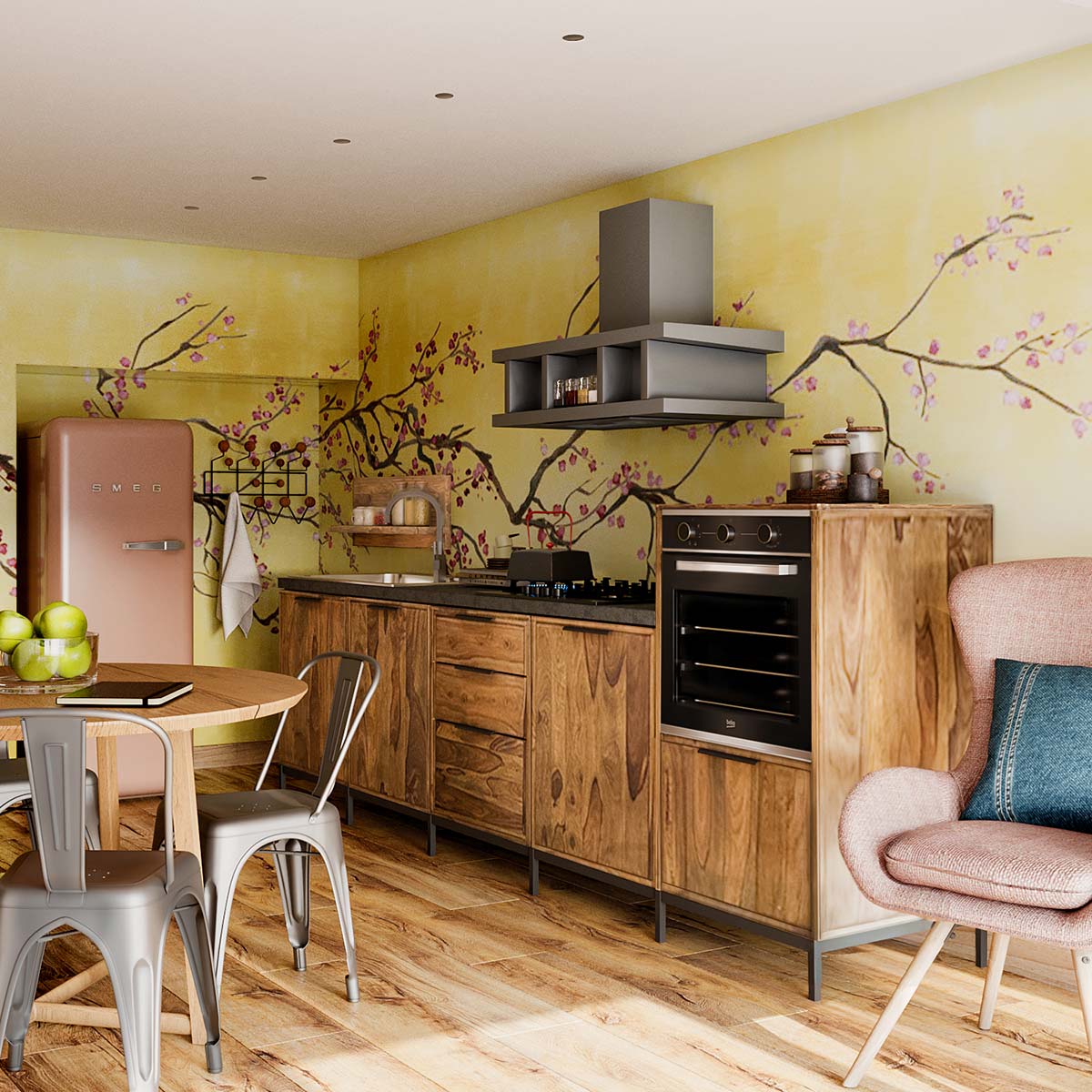 • Finiture curate: I piedini in ferro indiano alti 14 cm donano alla cucina un tocco industriale e conferiscono un senso di leggerezza all’insieme. Le maniglie in legno si integrano perfettamente con il design e completano l’estetica raffinata.