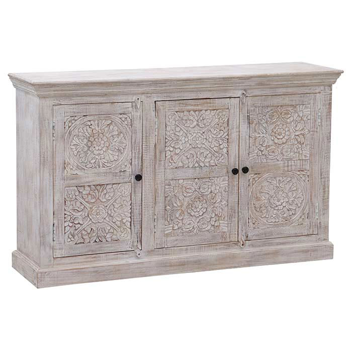 Le tre ante intagliate a mano presentano raffinati motivi floreali in rilievo, che richiamano l’artigianato coloniale d’epoca. Le maniglie in metallo brunito completano il design con un tocco di sobria eleganza. Ampio spazio interno per contenere e organizzare con stile.