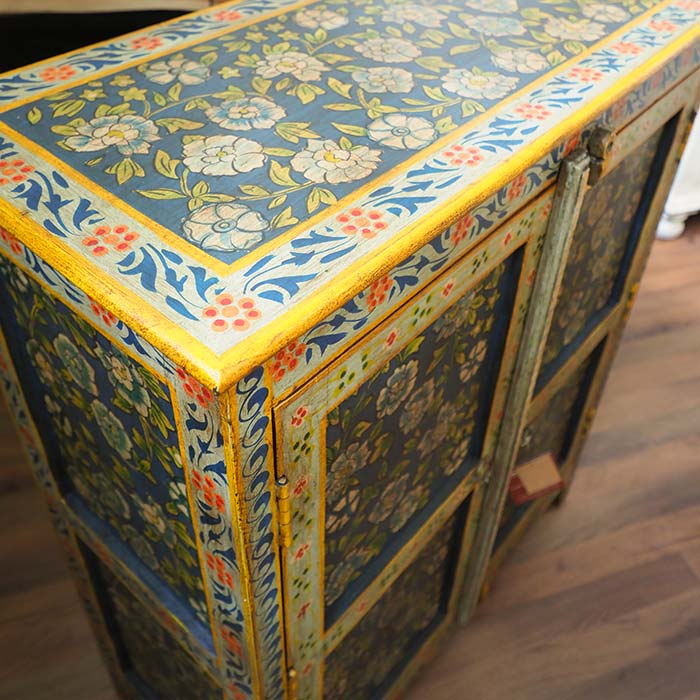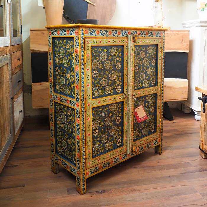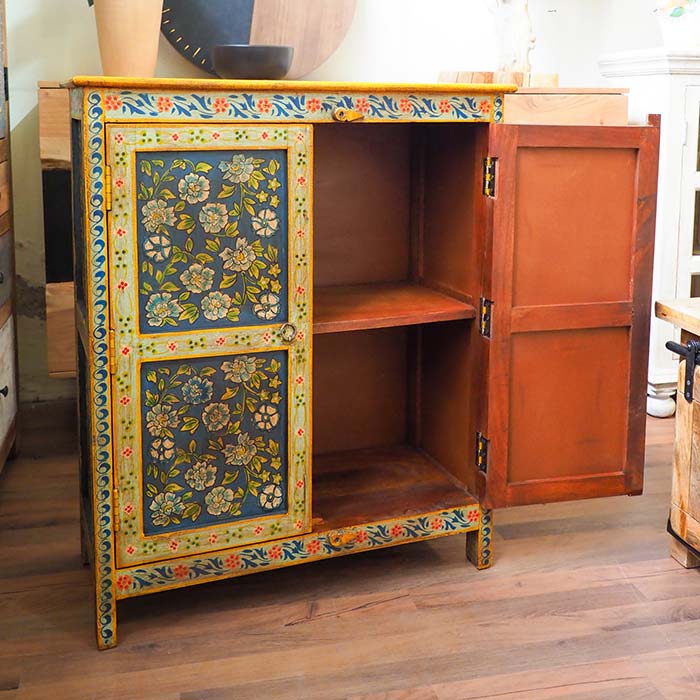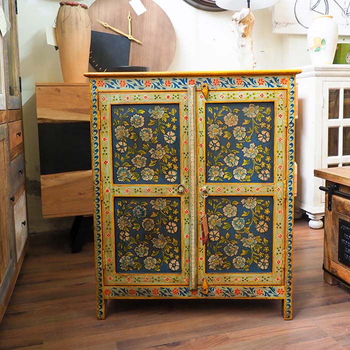Credenza orientale modello Frida dallo stile etnico, un vero capolavoro artigianale. Realizzata in legno di mango massello, è completamente dipinta a mano con raffinati motivi floreali, che donano un tocco di eleganza e unicità al tuo ambiente.