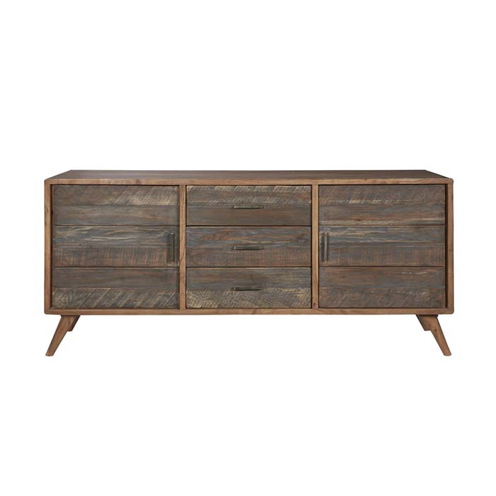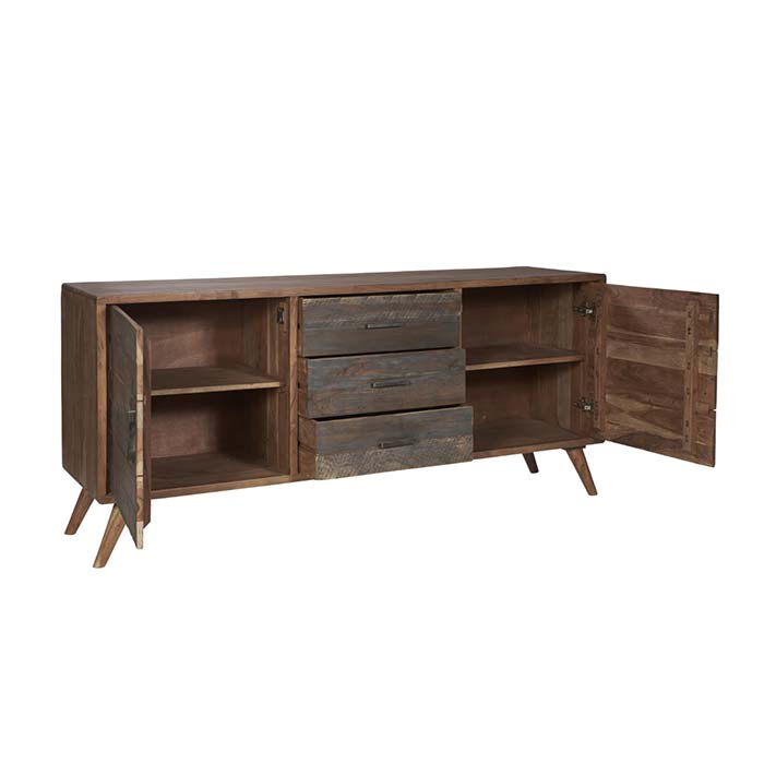 Madia credenza in legno massello di acacia dallo stile etnico vintage moderno, mobile composto da 2 sportelli laterali e 3 cassetti centrali