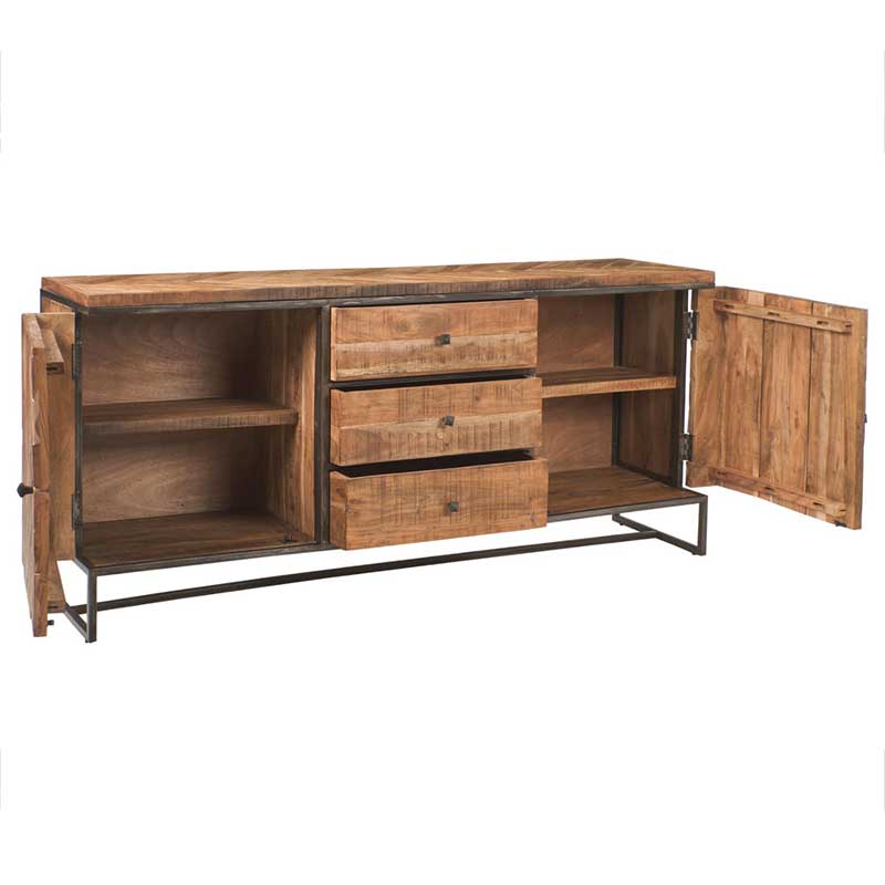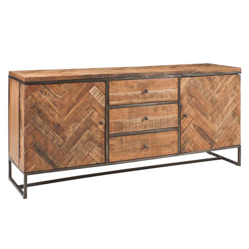Madia etnica moderno in legno massello con finiture parquet. mobile con 2 ante e 3 cassetti capienti occasione in offerta outlet.