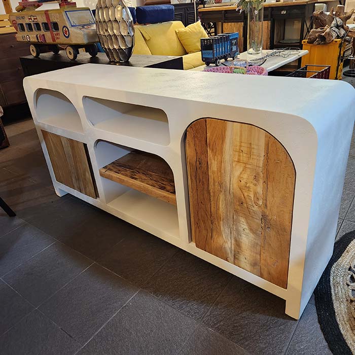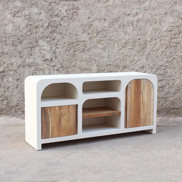 La struttura, realizzata in cemento romano con finitura spatolata, si fonde armoniosamente con le ante in legno massello di teak, creando un elegante contrasto materico. L’elemento distintivo è la linea ad arco evidenziata dall’asimmetria delle due ante, che dona dinamismo e raffinatezza all’intero mobile.