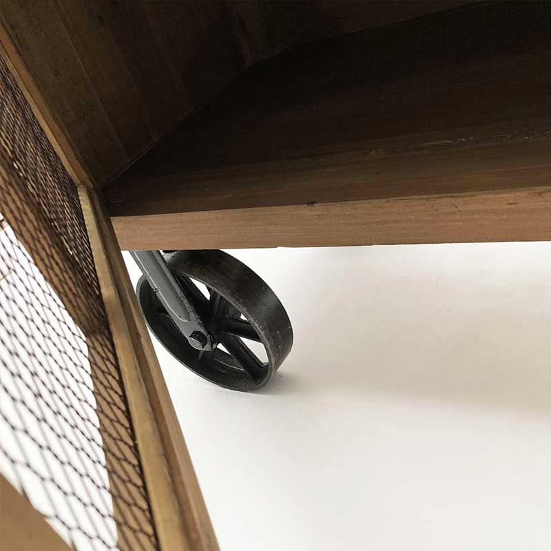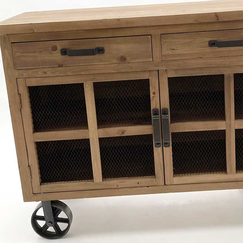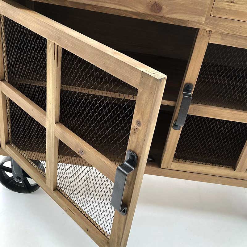Le ante presentano una grata in ferro che non solo aggiunge un tocco estetico ma anche praticità, permettendo di intravedere l’interno senza doverle aprire. Le ruote in ghisa, oltre a facilitare lo spostamento, conferiscono un ulteriore carattere al mobile, rendendolo un elemento distintivo nel tuo arredamento.