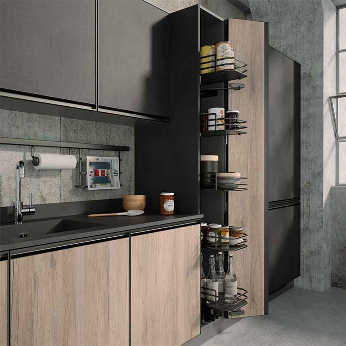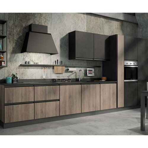 Bellissima cucina in stile industrial lineare completa di doppia colonna. Si compone di ante ad effetto materico con finitura color rovere nordico e resina grafite. Il top color grigio touch è spesso 2 cm e si abbina perfettamente. Da notare la particolare struttura in metallo che avvolge le ante rendendole esteticamente accattivanti e nello stesso tempo molto robuste e longeve. L’ingombro totale è di 450 cm di larghezza e 220 cm di altezza. Nel dettaglio la cucina è così composta: