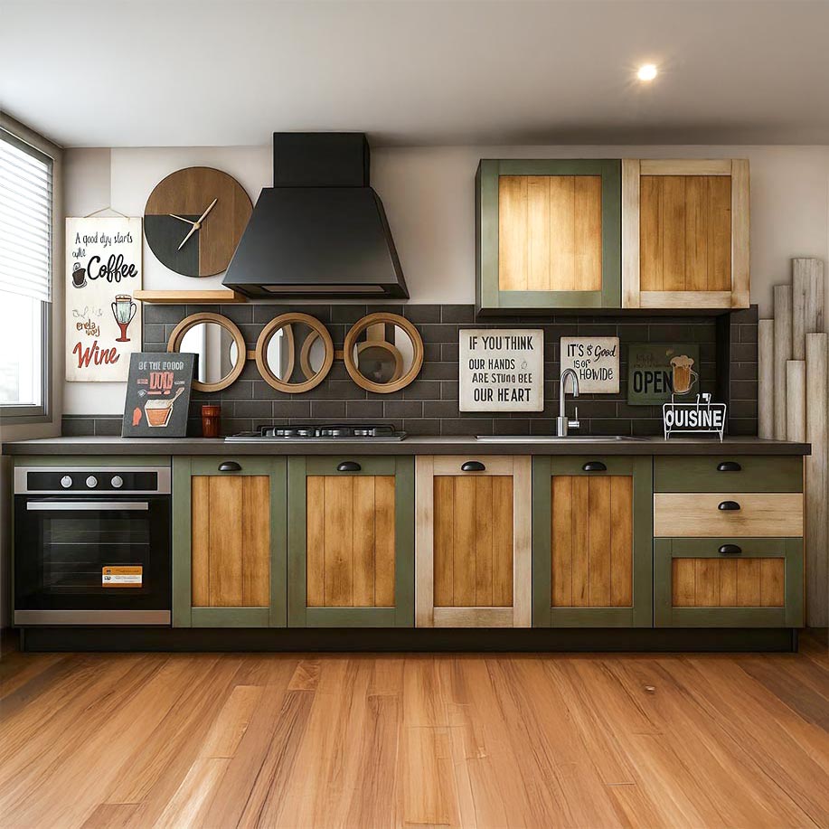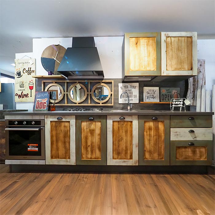 Cucina Rustica Industriale con ante in vero Legno Massello con finitura effetto invecchiato