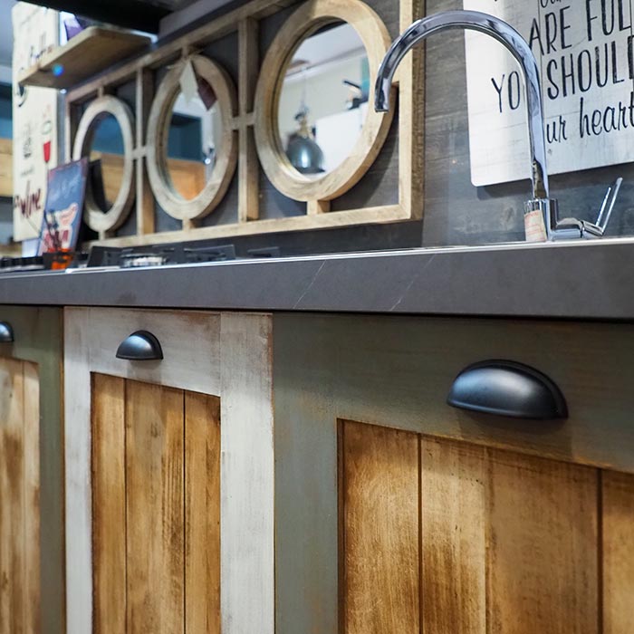 Le ante in vero legno massello sono realizzate artigianalmente, ognuna diversa dall’altra per finiture e venature con effetto invecchiato: un prodotto esclusivo, che rende ogni cucina un pezzo unico.