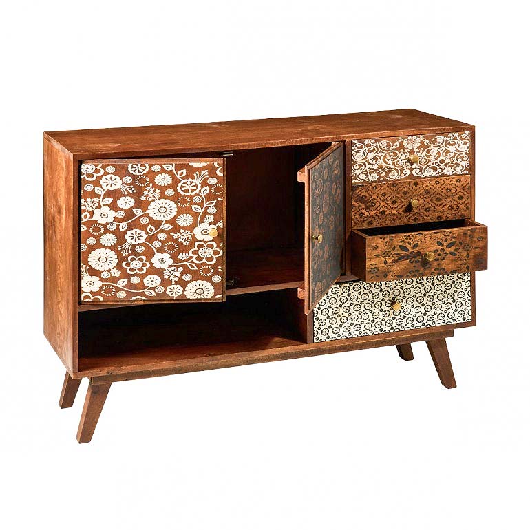La solida struttura è realizzata in pregiato legno massello indiano scuro, sostenuta da eleganti piedini svasati che donano un senso di leggerezza e ariosità all’ambiente. Ma la vera magia risiede nel frontale asimmetrico: le due ante e i quattro cassetti sono impreziositi da affascinanti decorazioni a contrasto con motivi floreali e mandala. Ogni scomparto presenta un pattern unico, creando un mosaico visivo irresistibile e accattivante.