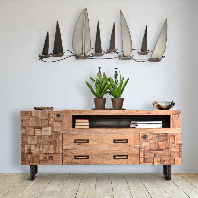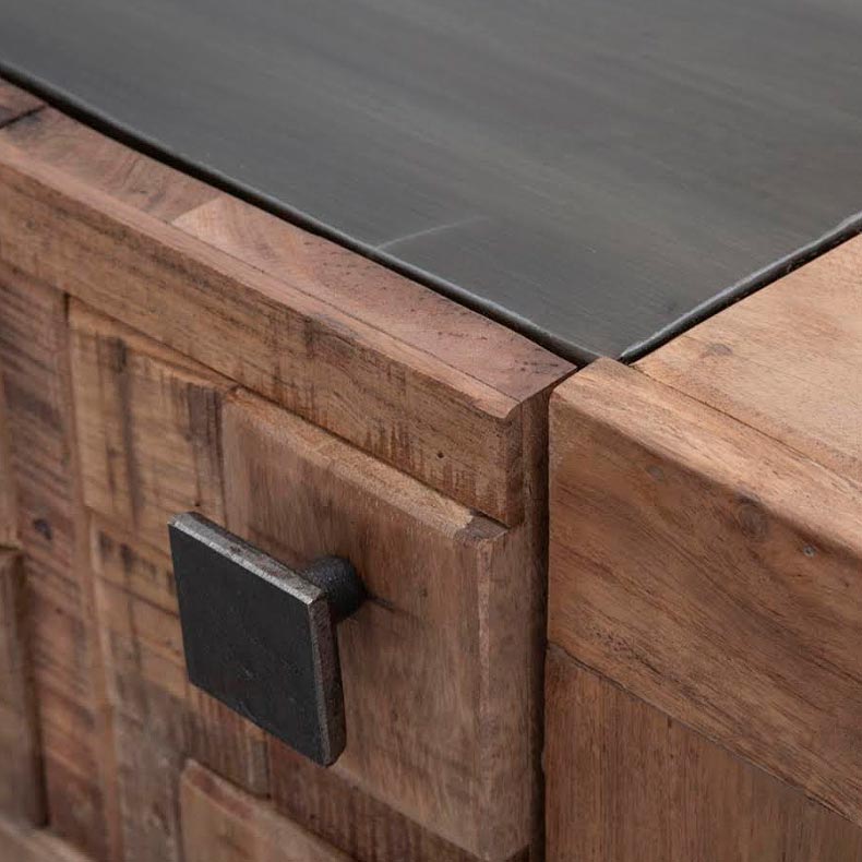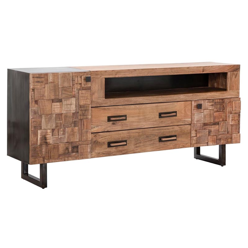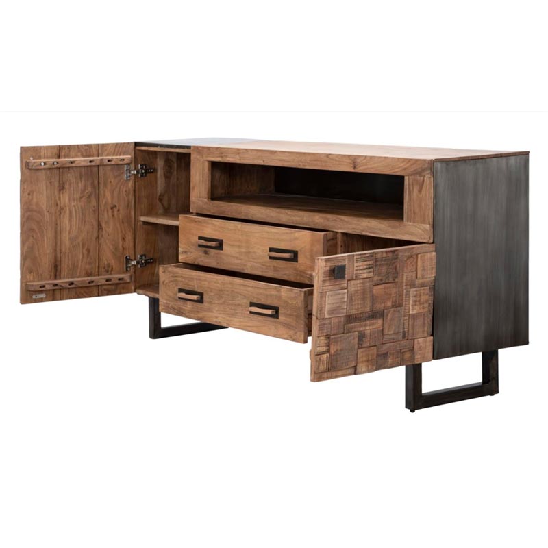 Mobile realizzato in legno massello di acacia con finiture in ferro, composto da 2 porte 2 cassetti e vano a giorno.