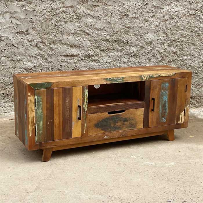 Mobile tv in legno massello in legno massello di recupero, composto da vani e cassetti. Mobiletto pratico e stiloso.