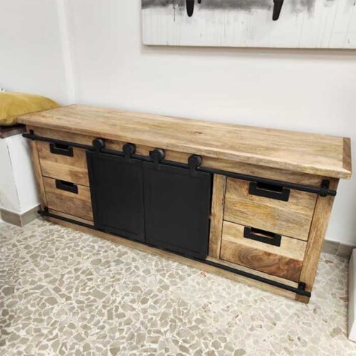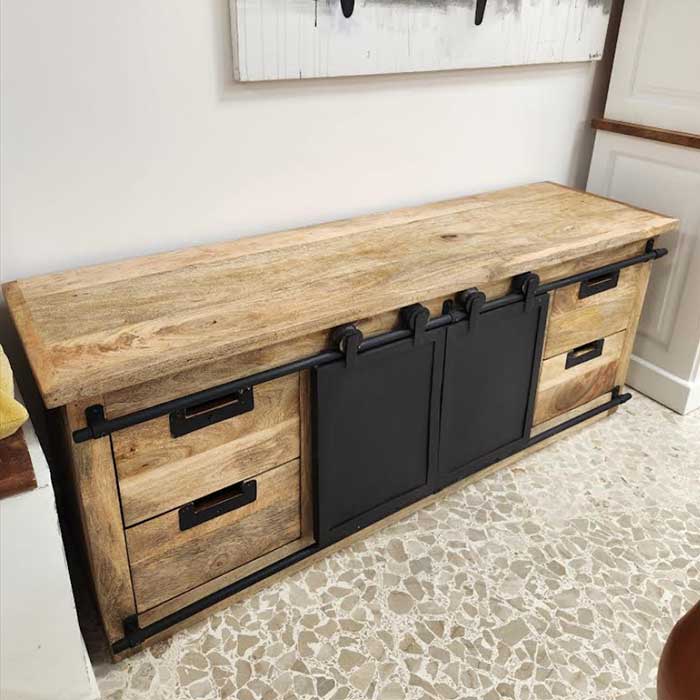 Mobiletto basso porta Tv in stile industrial vintage, porta televisione in legno massello di mango composto da 4 cassetti e 2 sportelli scorrevoli in ferro