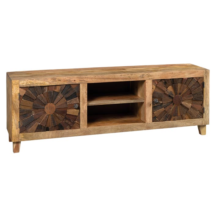 Mobiletto basso porta tv in legno massello composto da 2 sportelli con intarsi particolari, ottima soluzione da soggiorno in stile etnico moderno.