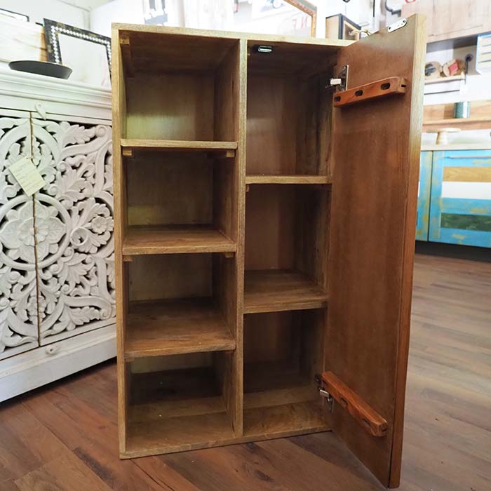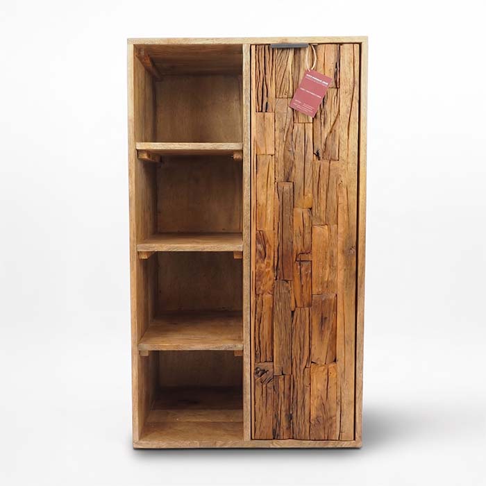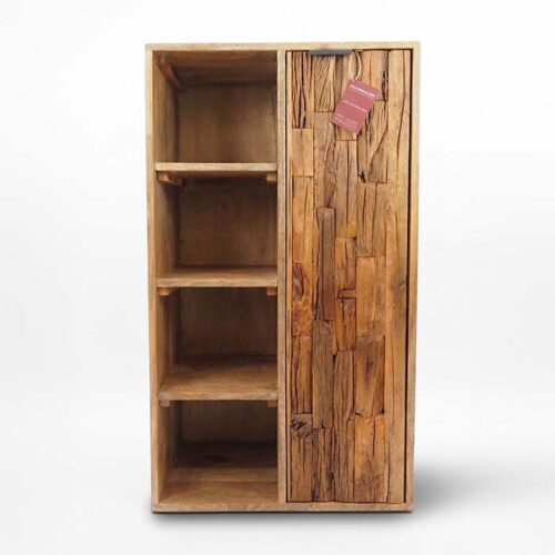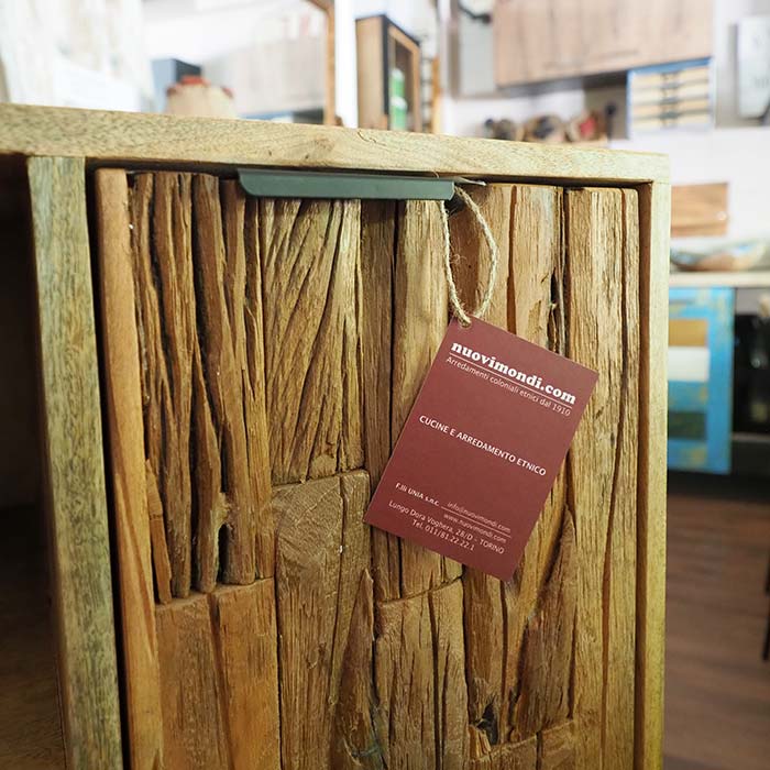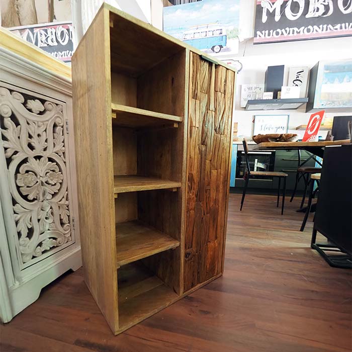 Organizza i tuoi spazi con stile e originalità. Questo mobiletto etnico in puro legno di Noce Indiano si distingue per un design asimmetrico moderno, funzionale e dal forte impatto materico.