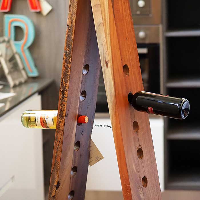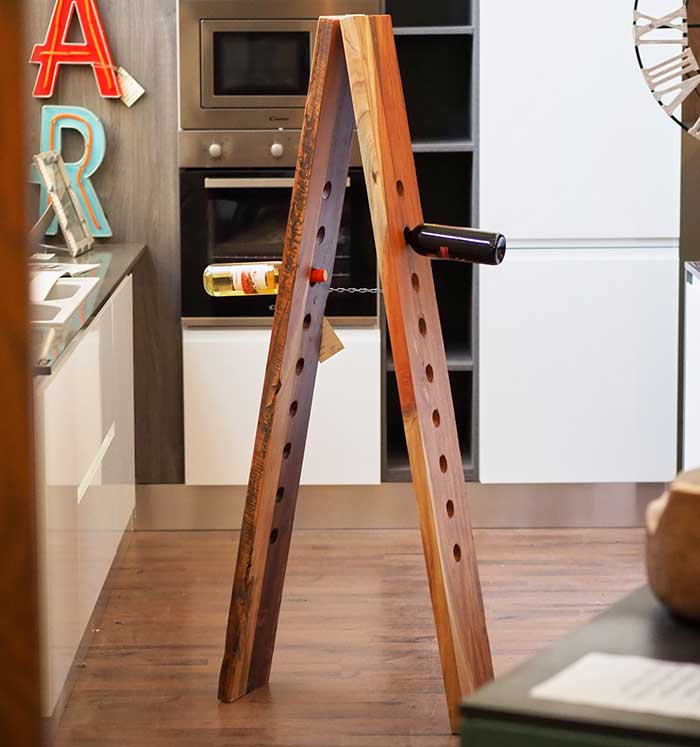 Originale mobiletto porta bottiglie in legno teak massello alto 160 cm con 18 fori porta bottiglie di vino. Stile etnico moderno per arredare la casa in modo originale ed unico.
