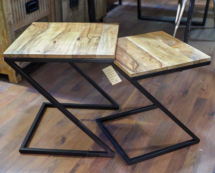 Set tavolini a z con struttura in ferro e ripiano in legno massello, piccolo cm 40 x 40 x 40 115€, grande cm 45 x 45 x 45 169€