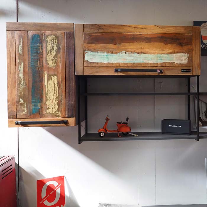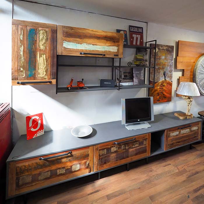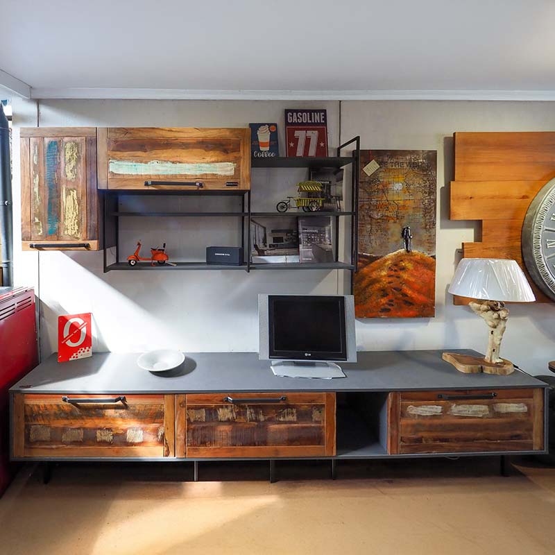 Parete Soggiorno Vintage in Legno con Libreria Industriale e Pensili