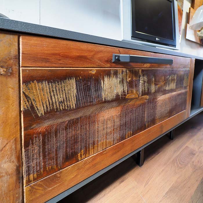 Questa parete soggiorno dallo stile vintage moderno in legno combina il fascino del design retrò con la solidità dello stile industriale. La struttura bassa poggia su piedini in ferro, garantendo stabilità ed eleganza, mentre i pensili alti 200 cm offrono ampio spazio per riporre libri e oggetti decorativi.