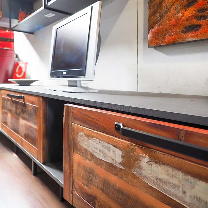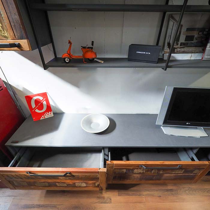 I 3 cassettoni da 90 cm includono vanI a giorno per una disposizione dinamica e funzionale, mentre la libreria industriale con struttura in ferro e ripiani in HPL grey aggiunge un tocco moderno e raffinato.
