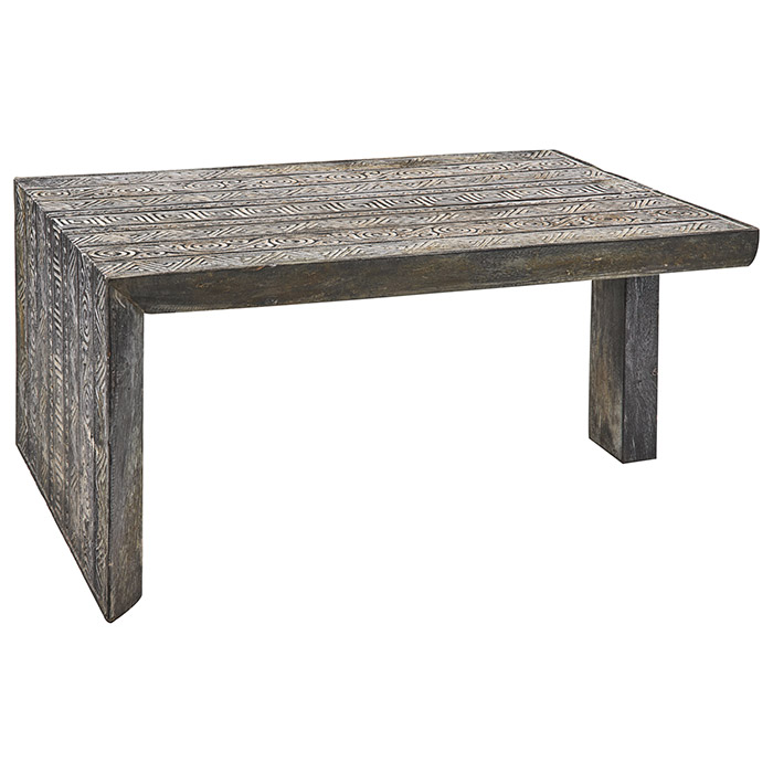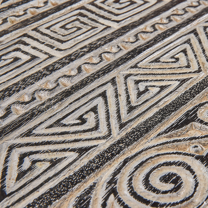 Tavolo basso in legno di teak. La sua particolarità sono le gambe diseguali che creano un curioso motivo geometrico, riprendendo i disegni intagliati a mano che lo decorano.