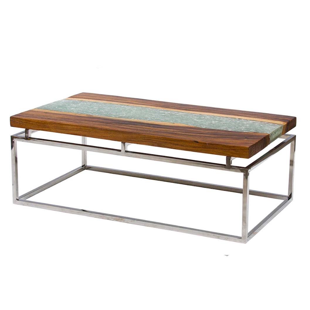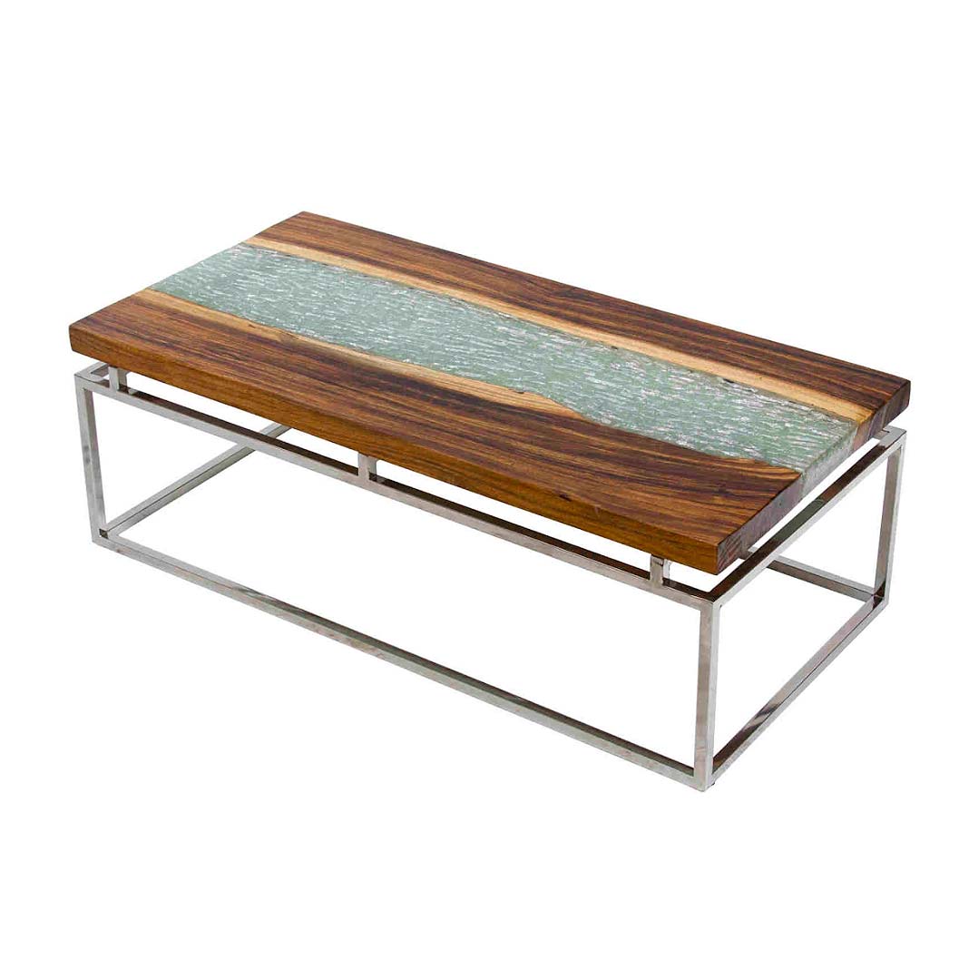 Tavolino basso in radica e resina con struttura in ferro, colore marrone e grigio.