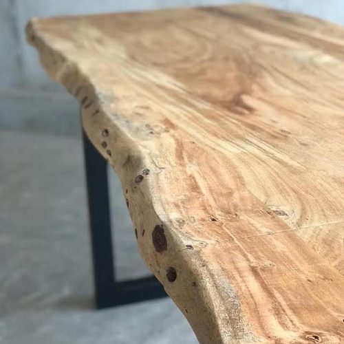 Bellissimo tavolo in legno massello naturale, struttura in ferro con piano dalla forma molto particolare tipica del legno naturale. Allungabile tramite 2 prolunghe da 40 cm cad.